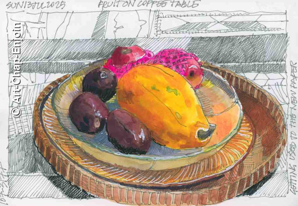 107-3177 – Fruit on the coffee table Image | July 31, 2025 | Art-Chap-Enjoin A good way to to test and get used to new paper is to draw something that I repeatedly sketch – fruit! Sun-13-Jul-2025 Share this:Tweet Email a link to a friend (Opens in new window) Email Print (Opens in new window) Print Share on Reddit (Opens in new window) Reddit Share on Tumblr Share on Threads (Opens in new window) Threads Share on Telegram (Opens in new window) Telegram Share on WhatsApp (Opens in new window) WhatsApp Like this:Like Loading... Related