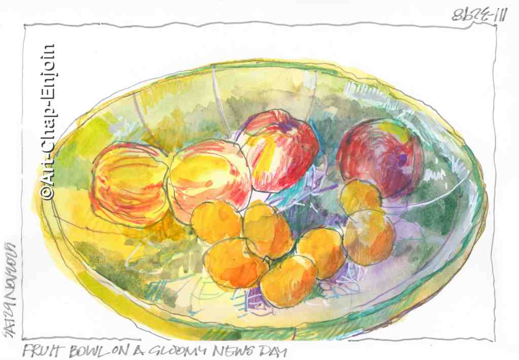 I missed an evening sketch the night before this, so I started my day with a coffee and a sketch of fruit on the coffee table in front of me – keeping it bright and cheery as I listened to the gloomy news on the BBC world service. I always find sketching a good way to relax and put aside work and worldly worries.