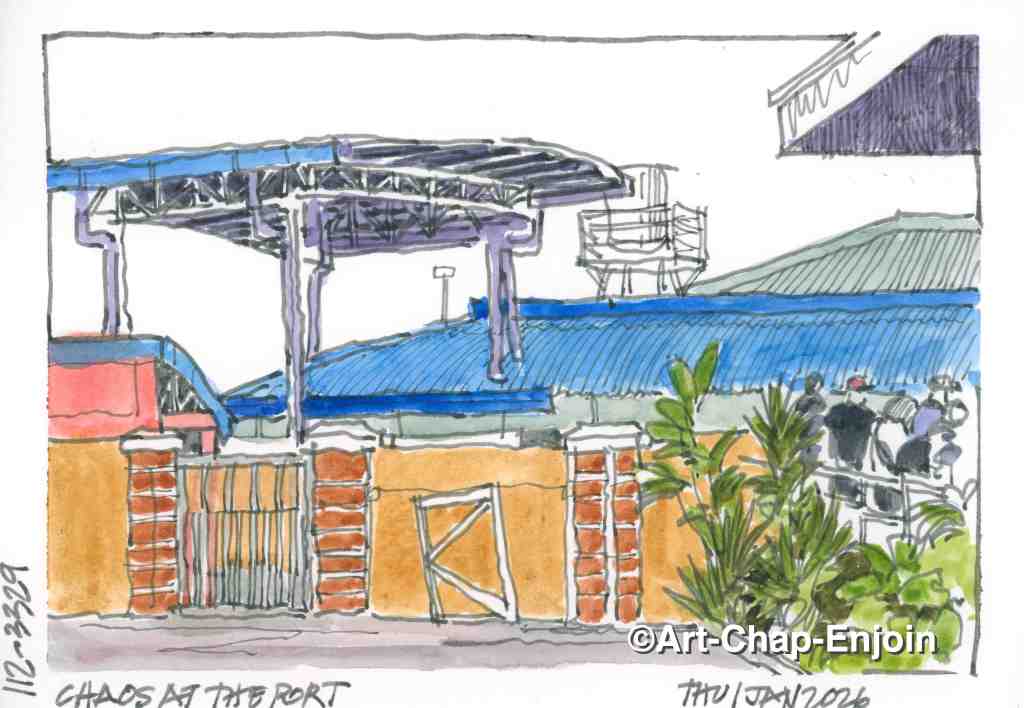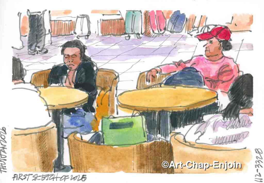 Here is my first series of sketches for 2026, done on the way to the Camotes Islands and Moalboal in Cebu. We arrived at terminal three in plenty of time…finding that Cebu Pacific (the airline), waited until the last moment to announce the gat…so we had a coffee at the Airport Cafe and while we waited. As always the airport was heaving with people and very few places to sit…so people sit on the floor or any perch they can find.