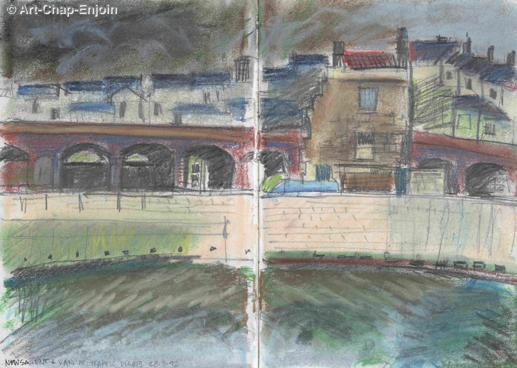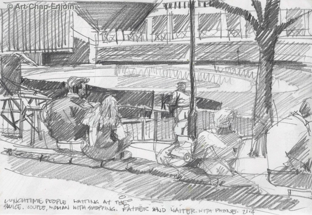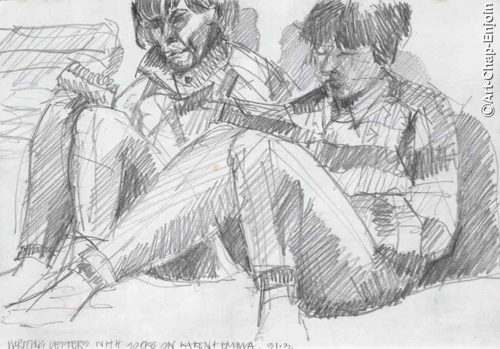 I didn’t have time to sketch today, so here is one from my archives. In 1992 I went to the WOMAD (World of Music, Art and Dance) festival in Morecambe. As with all music festivals the campsites get pretty muddy and my car got stuck in the mud – this sketch makes the campsite look more idyllic than it was. Luckily some guys helped push me out. If I recall rightly my tent also collapsed one night.