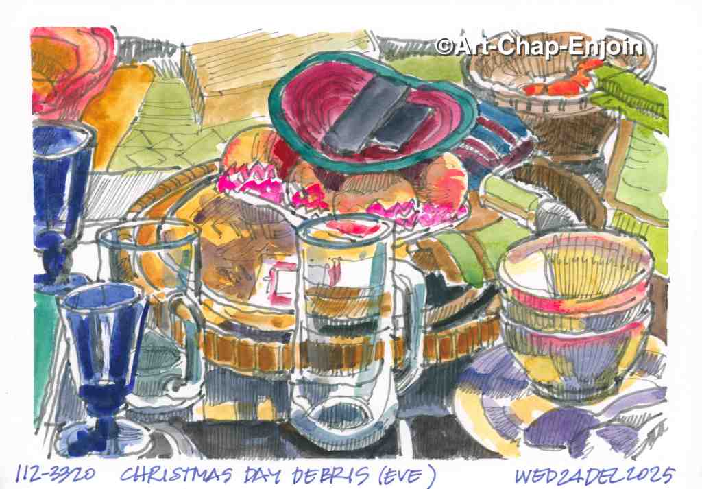 We had our big Christmas dinner on Christmas Eve as we have our big family gathering (out of town) on the 25th. We spent most of the day cooking, then ate it all (or at least overly large portions) in less than an hour. This is our coffee table sketched as we watched “It’s a Wonderful Life” for the nth time and dozed off.