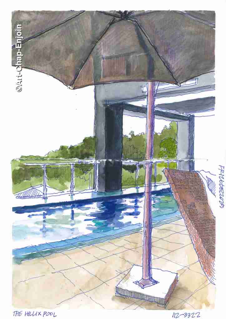 As we usually do these days, the Domingo (plus Price) clan gathered for a Christmas get-together – this time at a place called Hillix Resort in Los Baños. We paid for this as our Christmas gift to everyone – plus we handed out the kimchi I had made (see Sketch No.112-3314). Although the resort was a bit short on facilities, it had a nice pool (see next sketch), Karaoke and a great view. In the distance you can see Laguna lake (yes it is brown) and Talim Island. I used my new Noodlers”Kung Te-Cheng” blue ink for this…lovely!