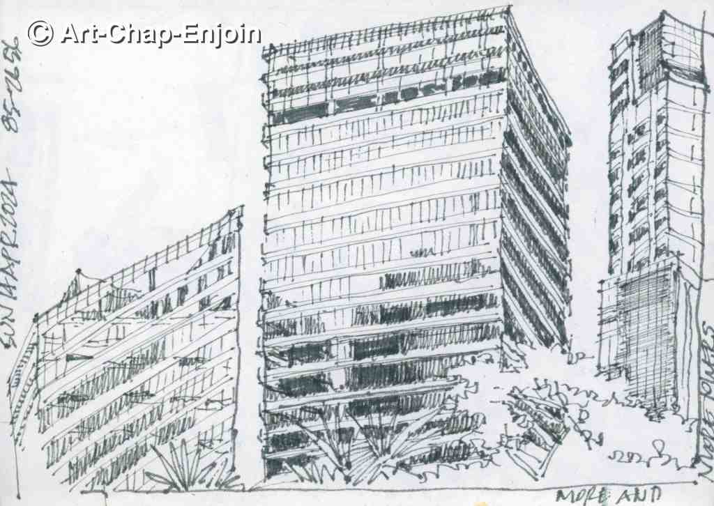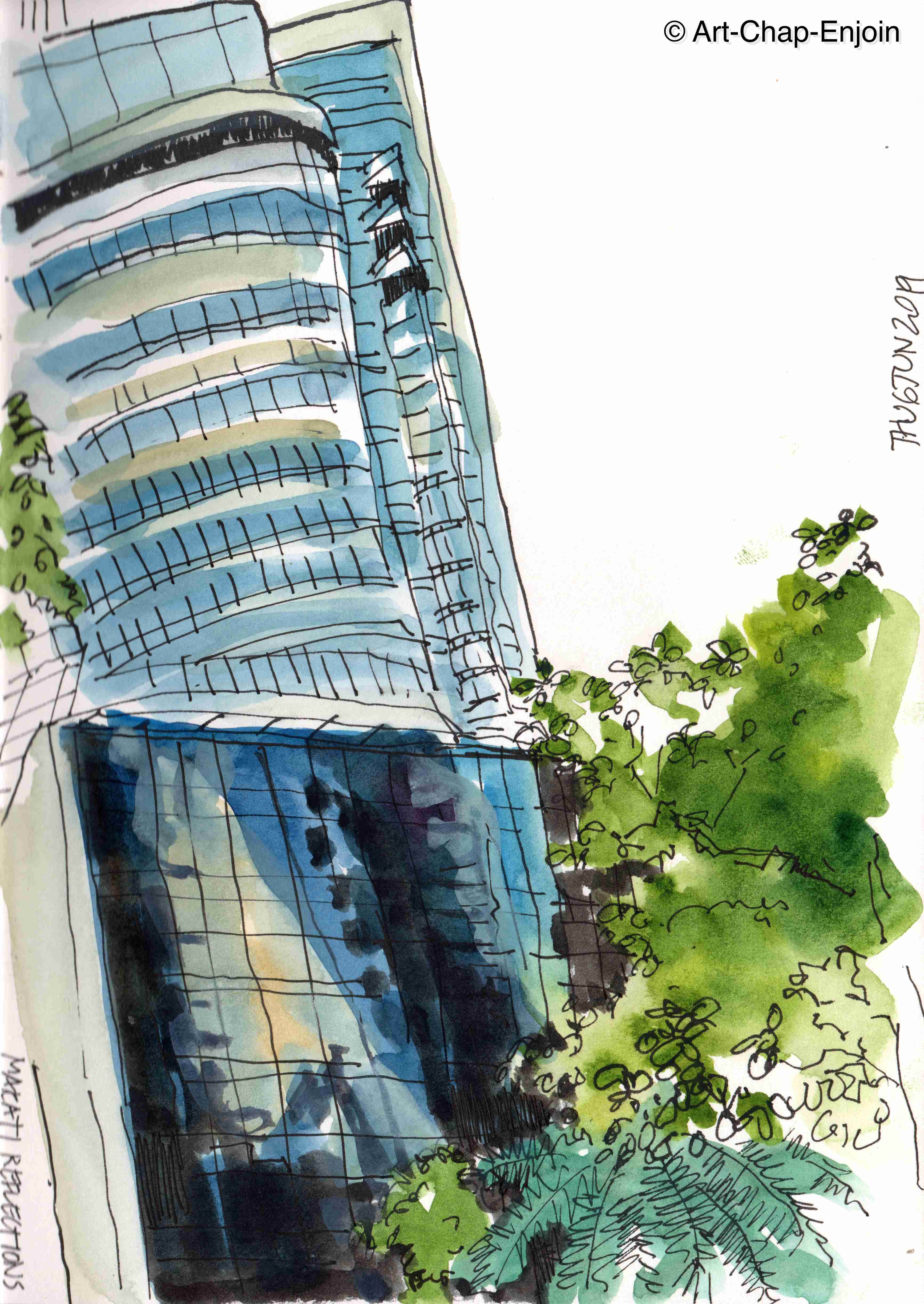 Finally I am getting round to posting my sketches done with #UskQuezonCity at the corner house. This building was designed (by Thai architects, the Department of Architecture, in collaboration with the BAAD Studio in the Philippines) as an “aesthetic community mall”, following an open air concept along the lines of “The Commons” in Bangkok. It houses a lot of small eateries and features an atrium circumnavigated by a ramp which is supposed to be a safe jogging path for residents of the area. The building is interesting, though maybe a bit over-designed with a forest of white steel columns, but we chose to sketch the view of San Juan you can see from one of the ramps. In my first sketch I started with a simple outline of the shapes and then filled in some details.