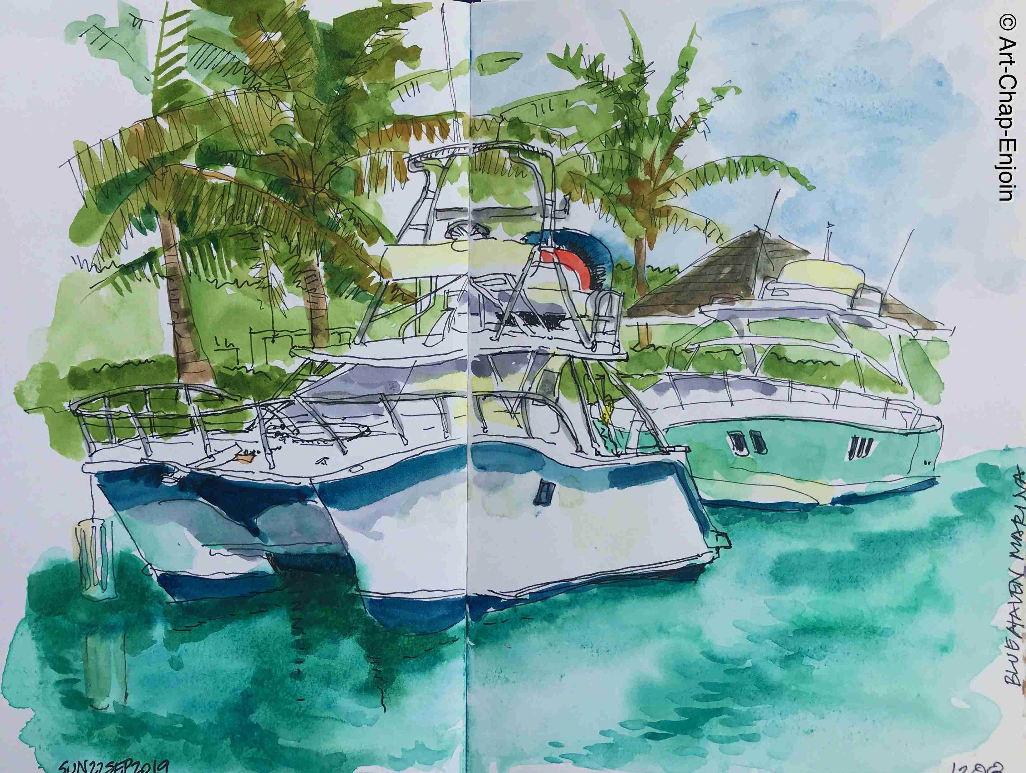On Sunday, having worked most of the weekend, I finally managed to get outside and do some sketching. I took a short walk to Blue Haven Marina, plonked myself near the jetty and quickly sketched this. It was getting dark so I had to be faster than usual….and then just as I was finishing it rained. I’d normally spend more time finishing a painting so this one has a half done feel! While I was drawing someone came and had a look – which is always nice.