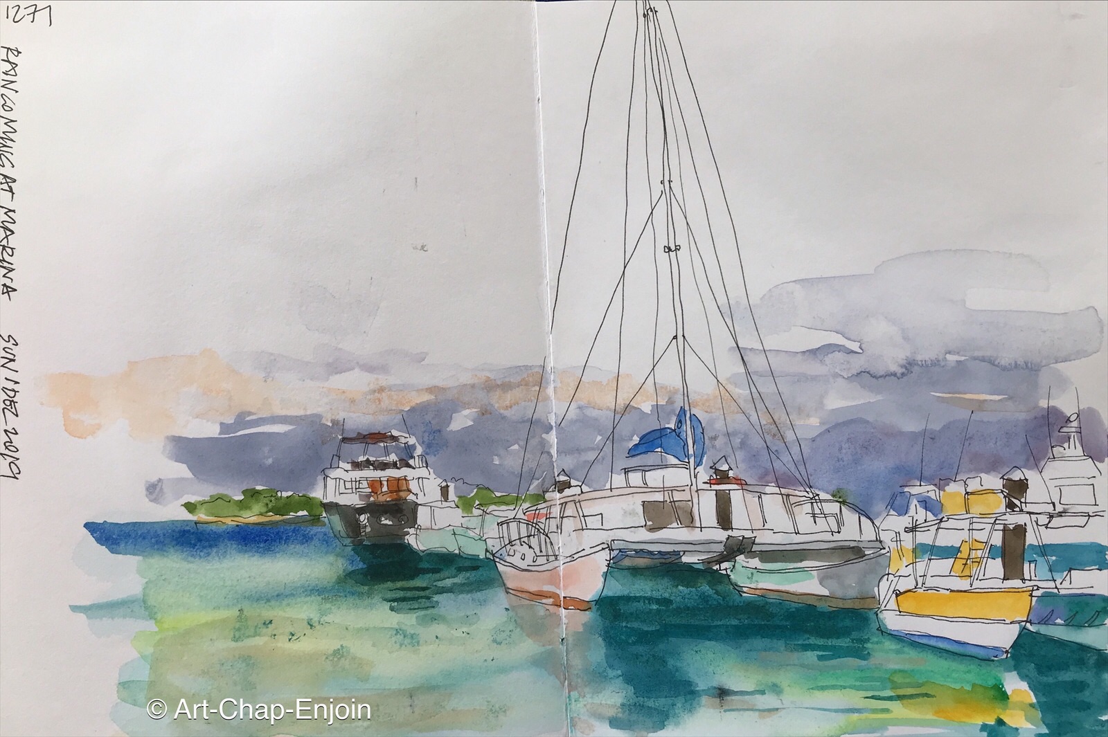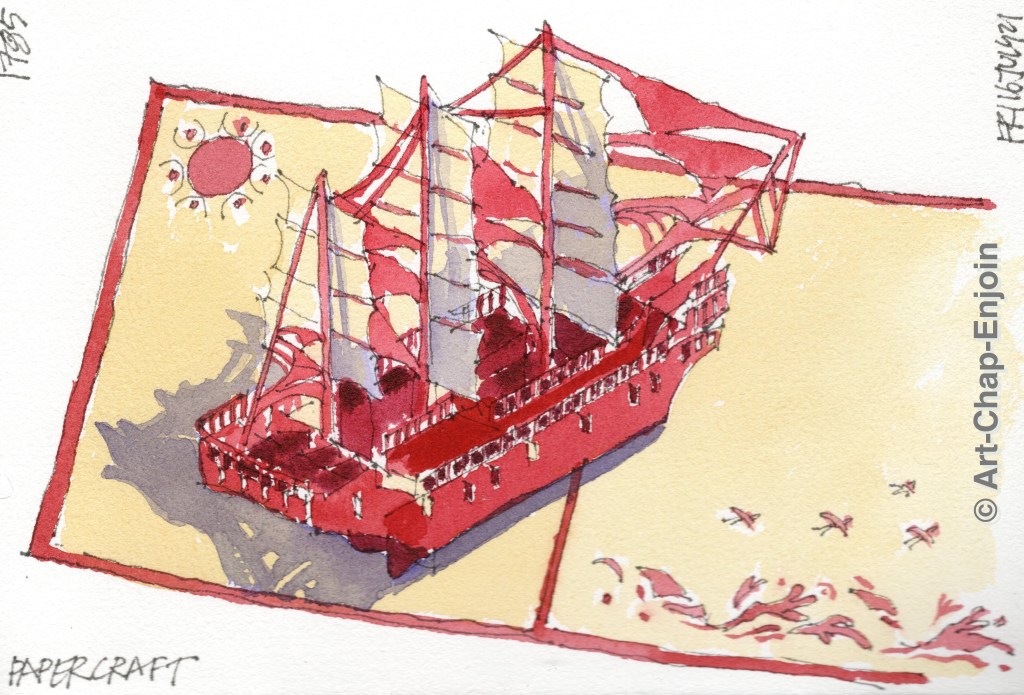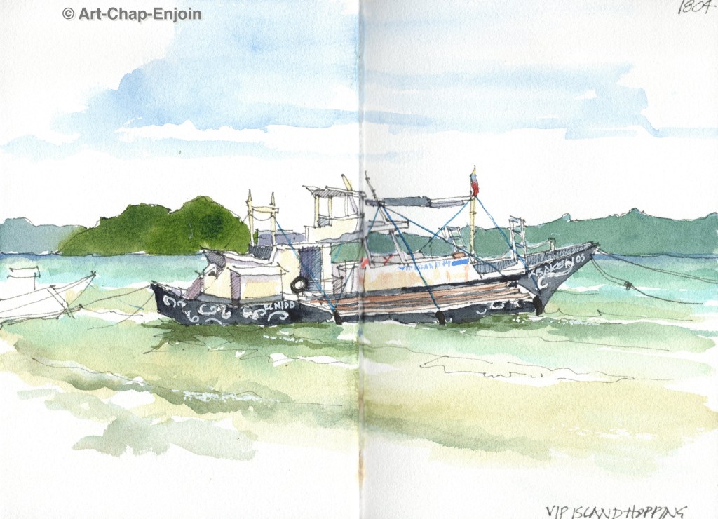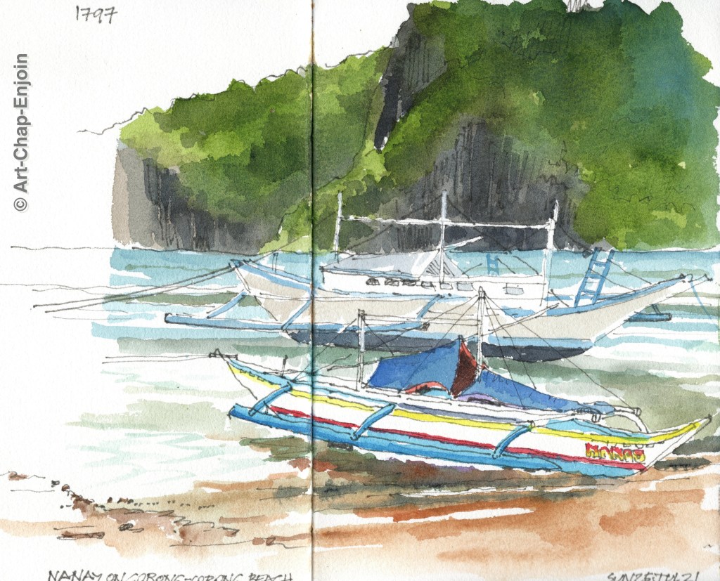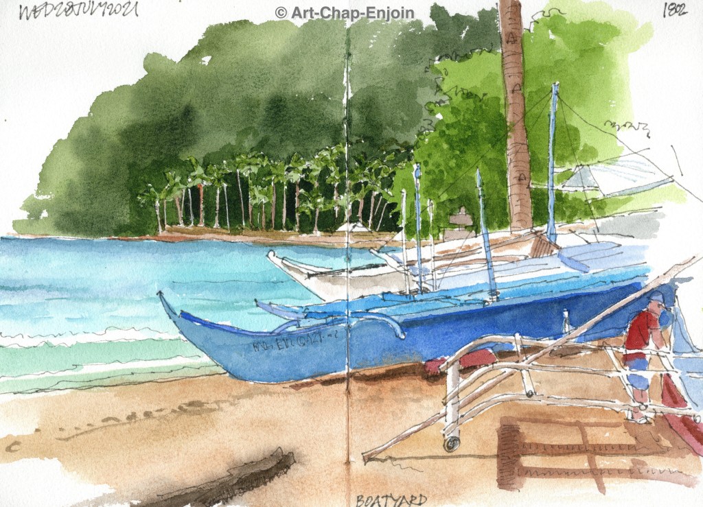 Here is the second sketch I did on our long weekend at the coast. Below the place we were staying (you have to go down a lot – and I mean a lot – of narrow steps, to get to the sea) there was this boat and jet-ski pulled up onto the hard standing. I know nothing about boats but I do love sketching them. I spent quite a bit of my time as I sketched this, chatting to a guy selling decorated blankets…it’s always nice to get a bit of feedback.