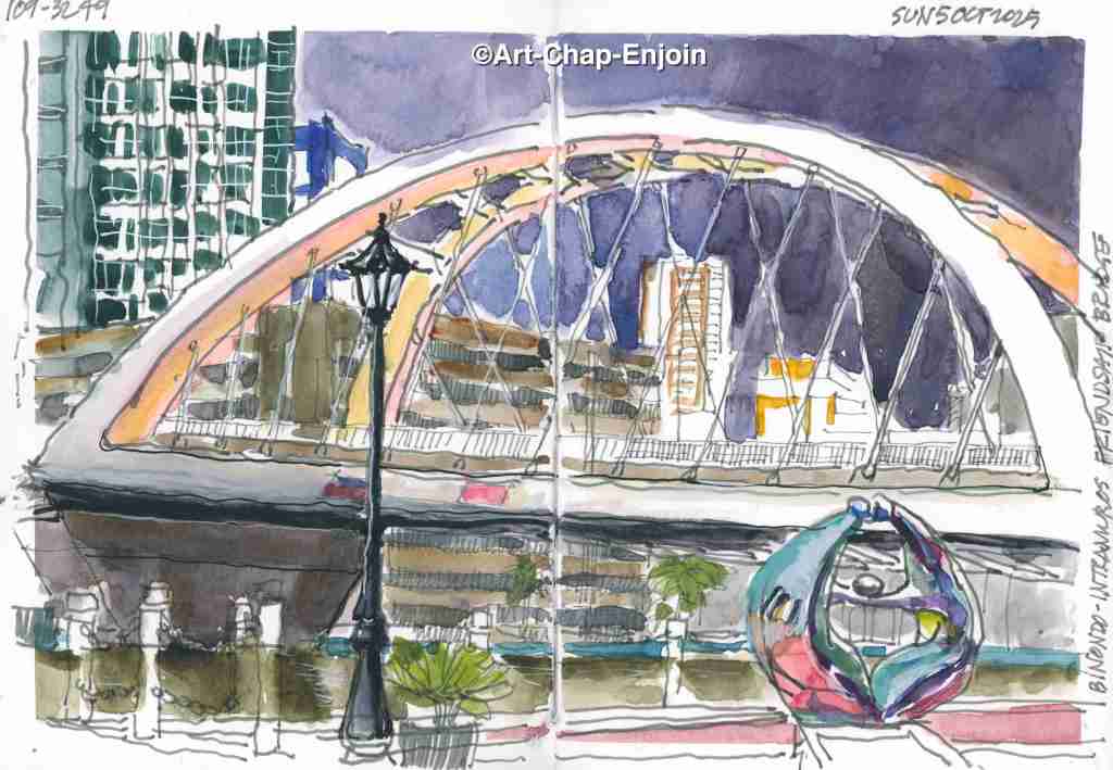This is the first sketch I did at the #UskManila #ManilaArtSihan event near Plaza Mexico in Intramuros. I found a good spot with my sketching friends Reuel and Al, in a rare bit of shade. I sketched this bridge earlier this year (see Sketch No.101-3050) – this one is less carefully done! Rushed this a bit as I thought it was going to rain. I could only find one post online that said that the sculpture in the foreground (with text in Chinese and Baybayin) “signifies the strong friendship and cultural bond between China and the Philippines”…no indication of who the artist is though!