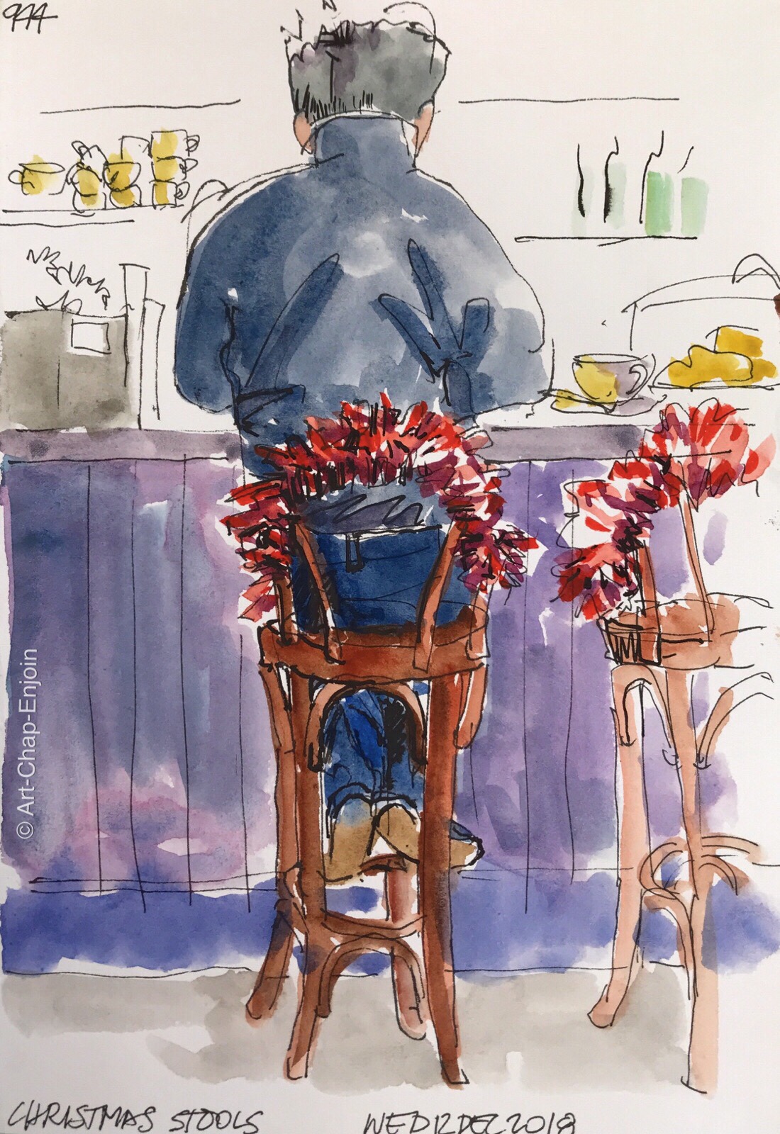 On Wednesday we went to buy a Christmas tree in Hadleigh. Afterwards we had a coffee in a little cafe called Crabtree’s and I had a brief moment to sketch someone perching on one of the bar stools which are decorated with tinsel. Now I realise how difficult tinsel is to paint!