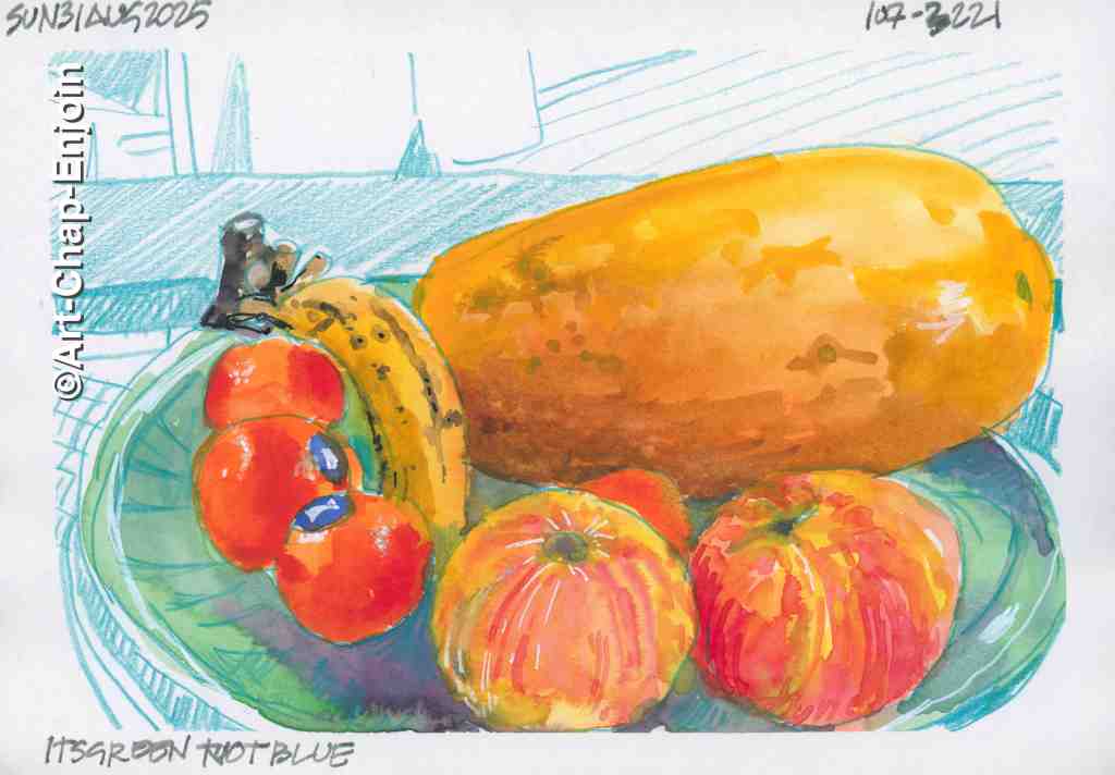 I missed an evening sketch the night before this, so I started my day with a coffee and a sketch of fruit on the coffee table in front of me – keeping it bright and cheery as I listened to the gloomy news on the BBC world service. I always find sketching a good way to relax and put aside work and worldly worries.