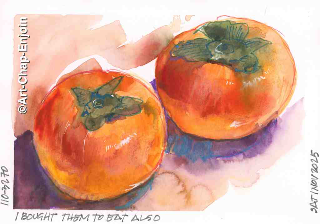 I bought these persimmon at the wet market…I confess partly just to sketch them! I’ve drawn one before (see sketch No.69-2283 in Jan 2023) but also took it an an opportunity to test my new paper. It buckles a bit (only 220 gsm after all), but lets the watercolour mix fairly well and doesn’t pill…so far…so good.