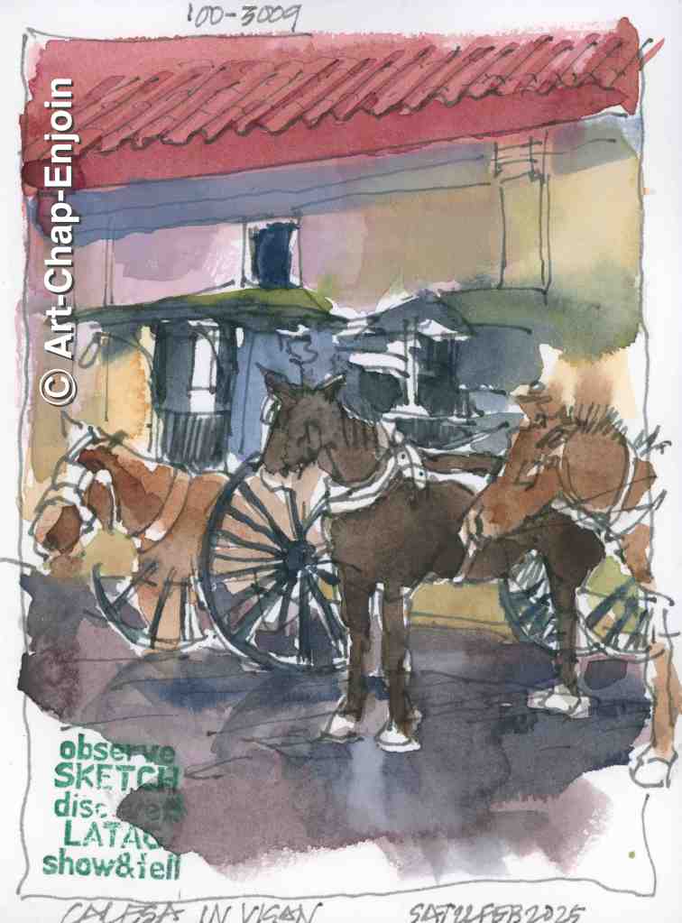 The first sketch is of the memorial to Dr. José A Burgos (a Filipino Catholic priest who was born in Vigan, accused of mutiny by the Spanish and executed by them along with two other clergymen). The second sketch is of the bell tower of Vigan Cathedral which is being reconstructed after being damaged by an earthquake in 2022. I then sketched the statue of José Rizal in Salcedo Plaza which faces the cathedral. At the end of the session I rushed to squeeze in a sketch of all the Calesa waiting at the edge of Burgos Plaza…I thought they would stay still but in fact every few moments one of them left to pick up a passenger….business must be good.