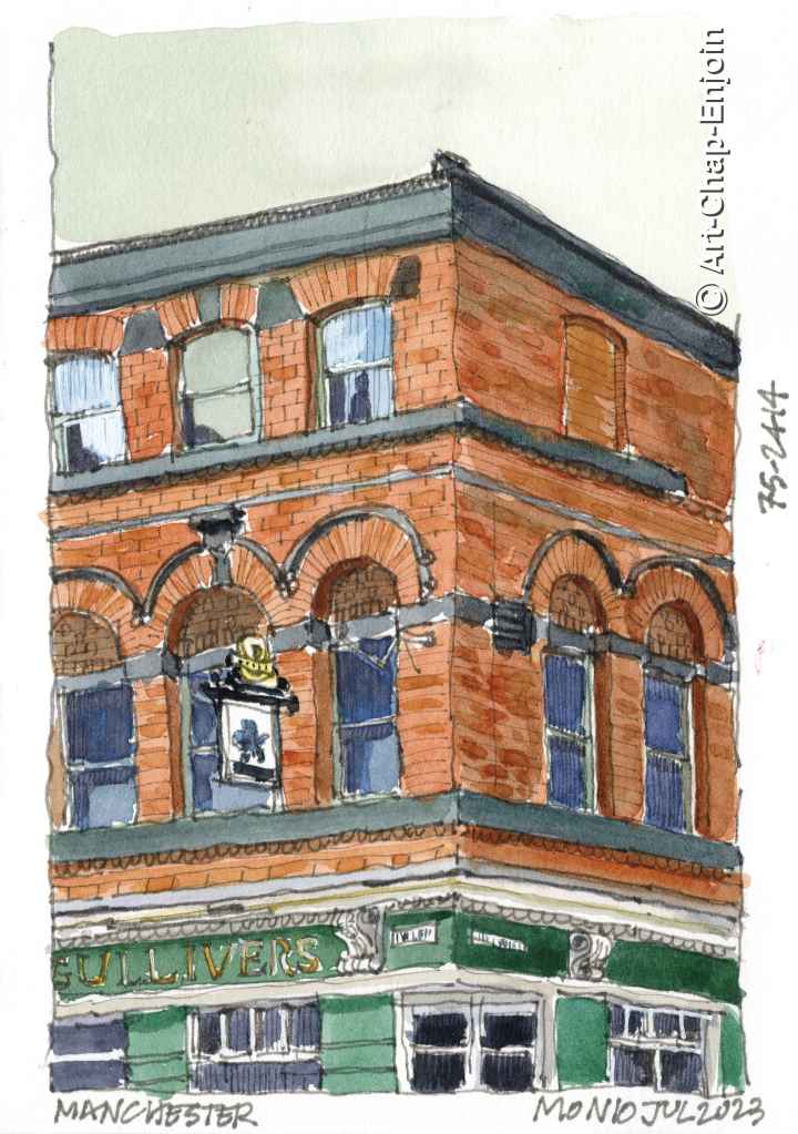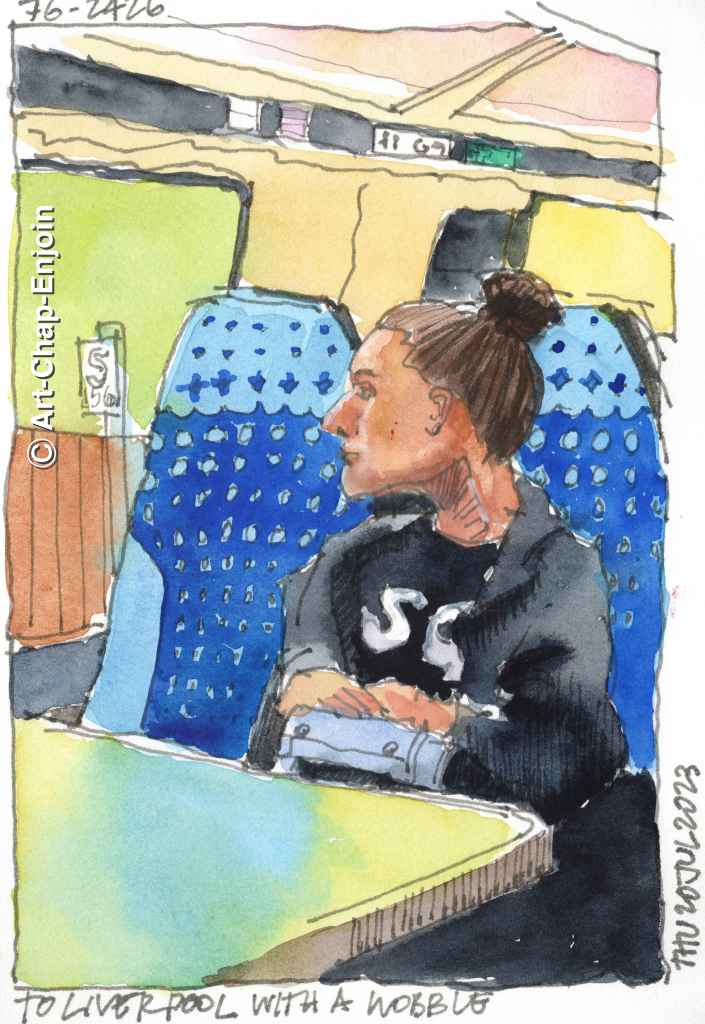 I am still catching up with posting sketches from our trip to the UK. This one was done on the day our youngest daughter graduated – on the train journey from Manchester to Liverpool (again we were really lucky with the weather thank goodness). I added the colour later as it was a short but very shaky trip. I also realised later that this lady looks a bit out of proportion – but I was quite pleased with the way her face came out.