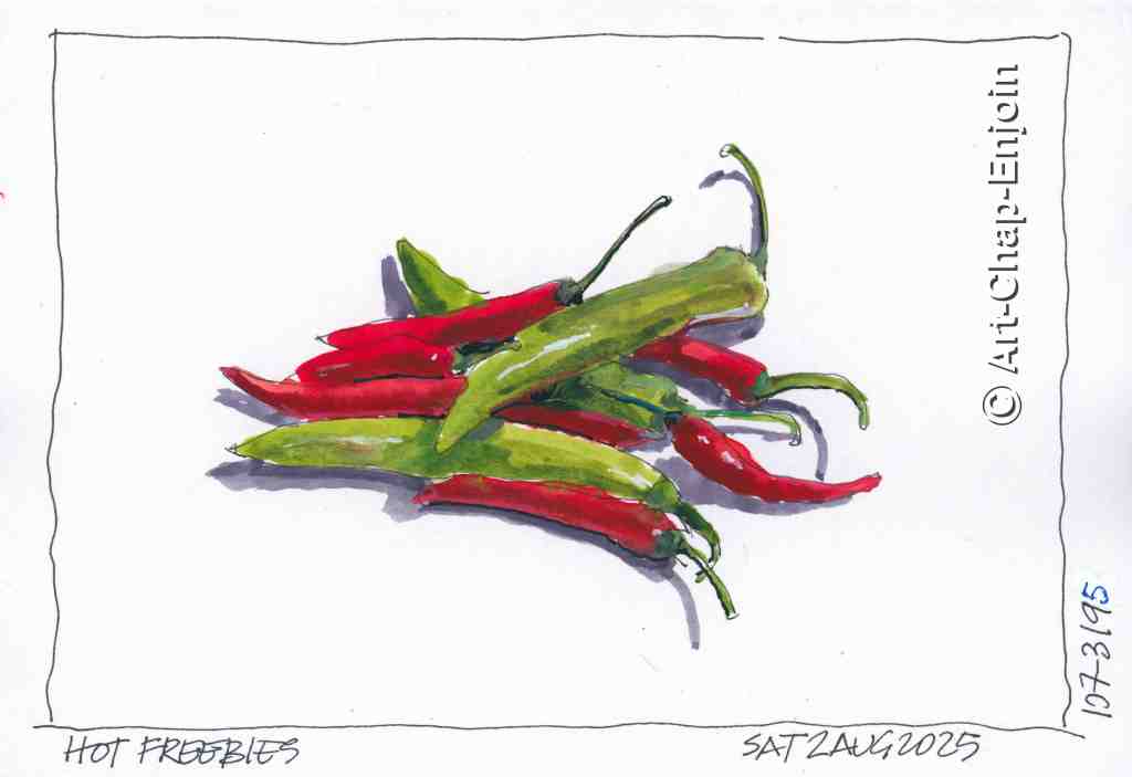 Our regular seller at the local market often gives us a few freebies (maybe things they have too many of or that are likely to go off soon) – this time it was some chillies! I wanted to get them looking brighter and shinier in my sketch …next time I’ll do better.