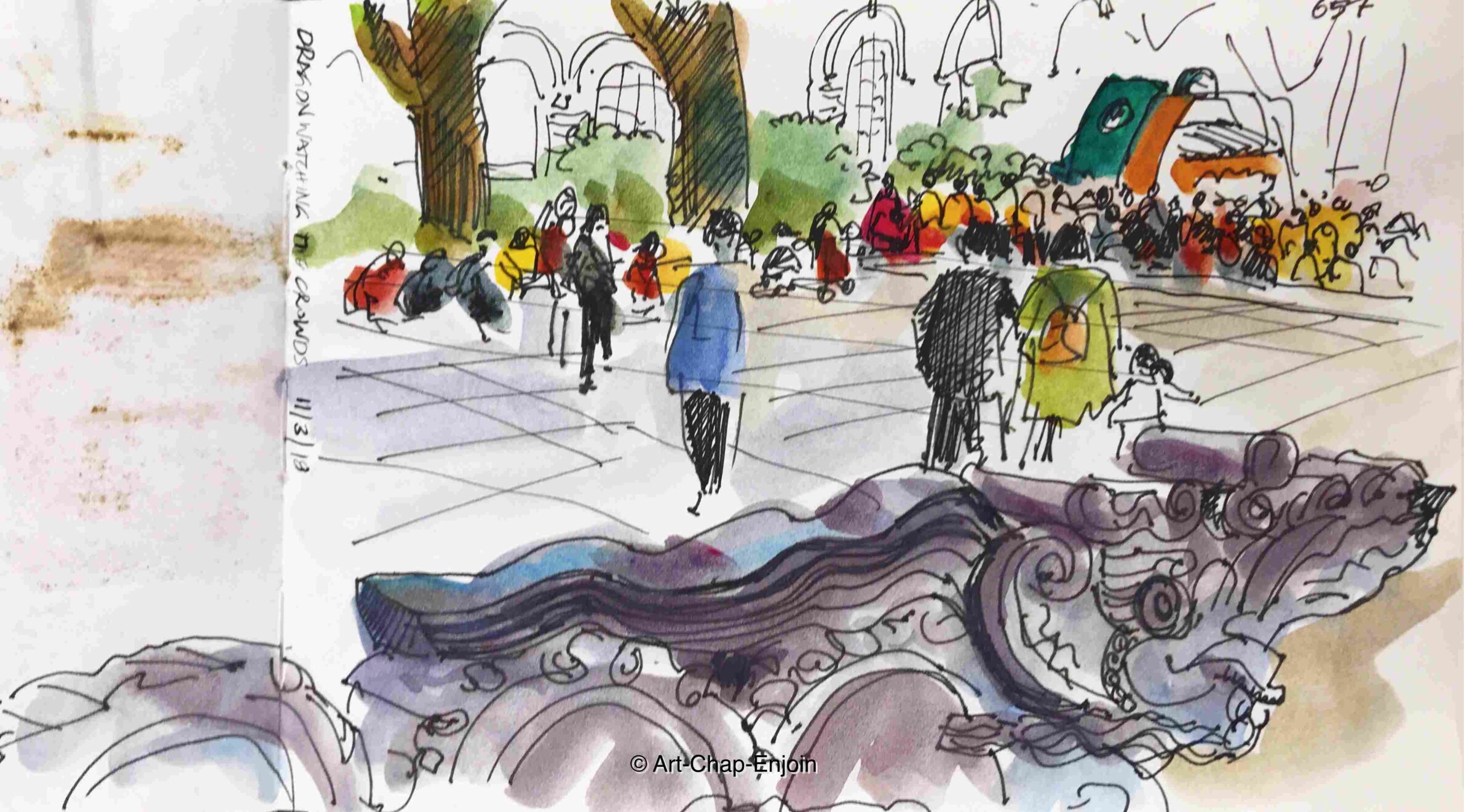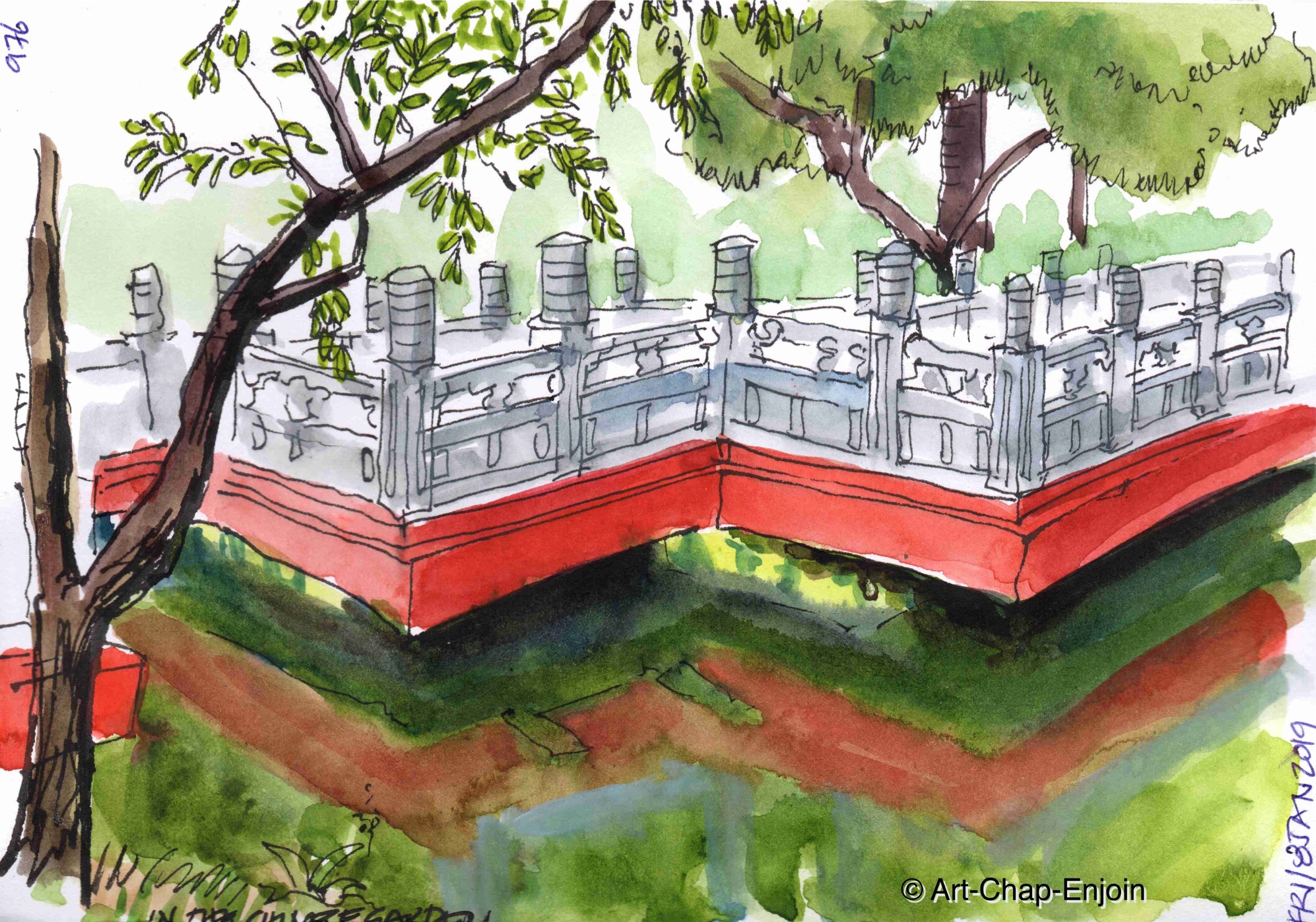 Here is my last sketch from the QC Urban Sketchers sketch-walk at Ninoy Aquino Parks and Wildlife Center last Sunday. This spot is popular with wedding and pre-nuptial photographers – we saw several brides dressed in traditional white and this one in red.