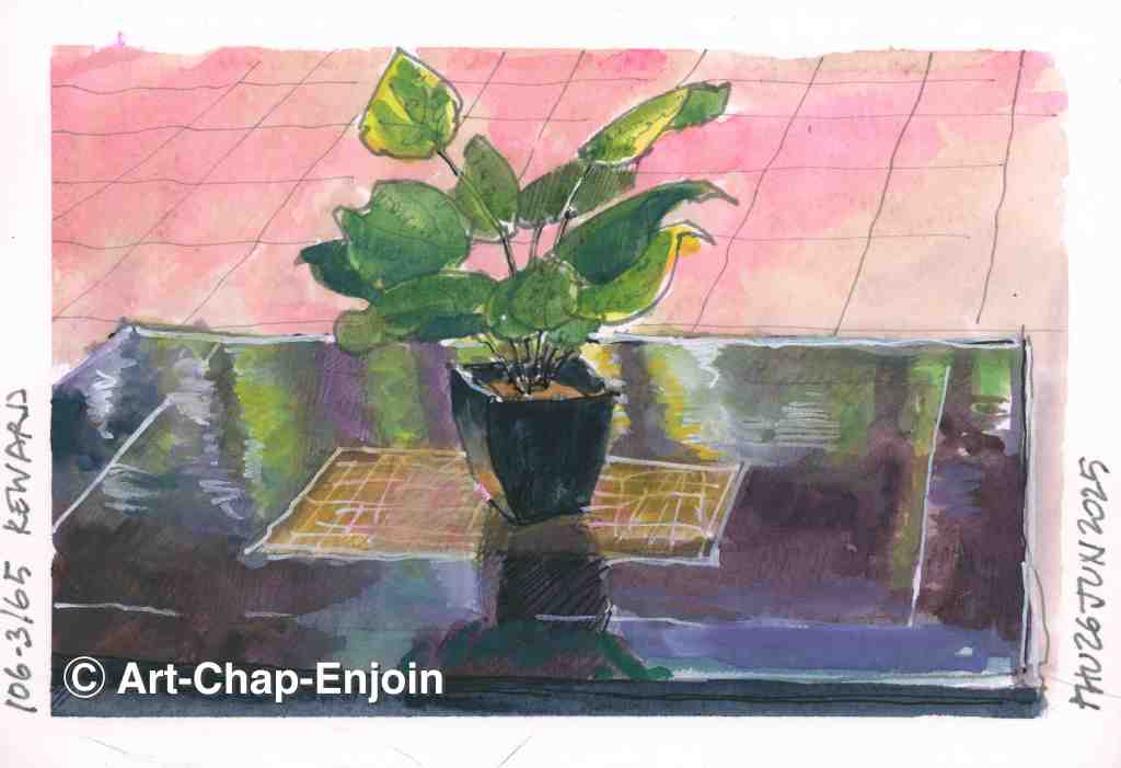 If I don’t use my preppy pen (with the blue sludgy Kung Te-Cheng Noodlers ink) every day, it dries up (update….even every day is not enough…it just dries up anyway). I had to work hard to get the ink flowing when I did this sketch…I next tried a little bit of damp tissue in the cap but that didn’t work either. This is one of the plants (one of the few that grows despite our “black thumbs”) that grows well on our balcony.