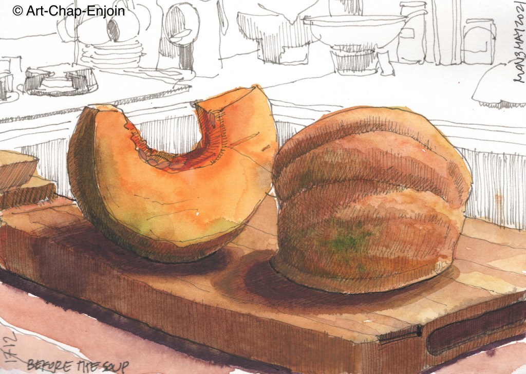 I made pumpkin soup for dinner the other day (with dill seeds which gives it an interesting flavour), but before cooking I decided to sketch the pieces of pumpkin. The soup also had onions in it – and then we had it with pesto flavoured bread rolls and sour cream…yummy!