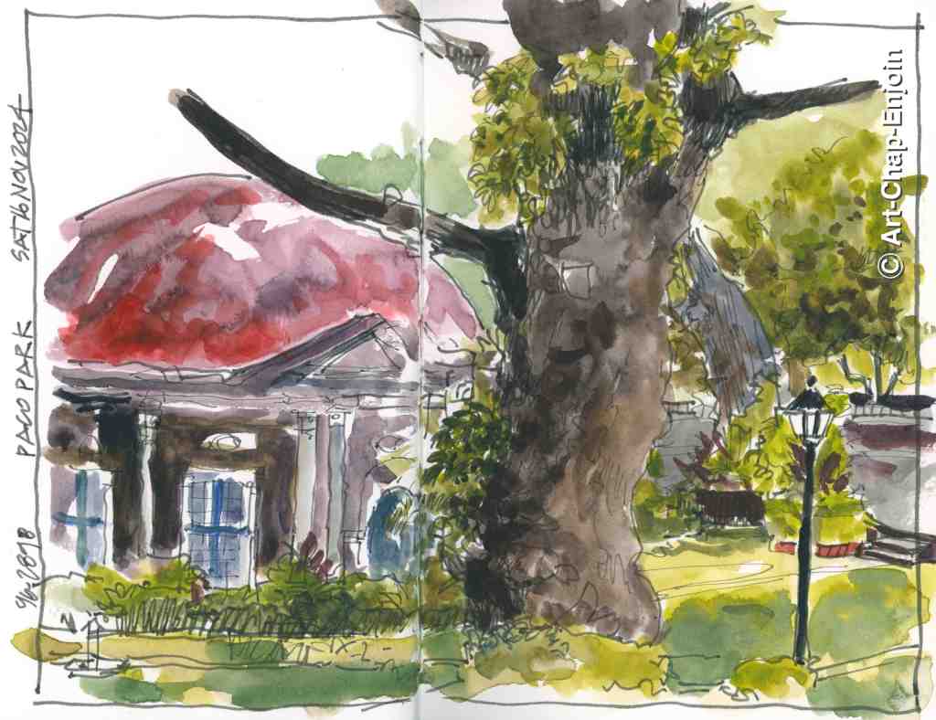 On Sunday 12 January we joined our first #SketchWalk of the year with #UskQuezonCity at the University of the Philippines sunken garden. The sunken garden is a large green basin-shaped area at the Diliman campus, surrounded by large trees and is popular as a venue for sports and outside events. I did this first sketch of a group of young guys quite quickly…after 15 minutes they all got up and left together, so I had to be fast.