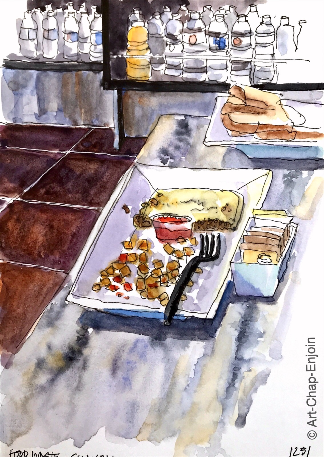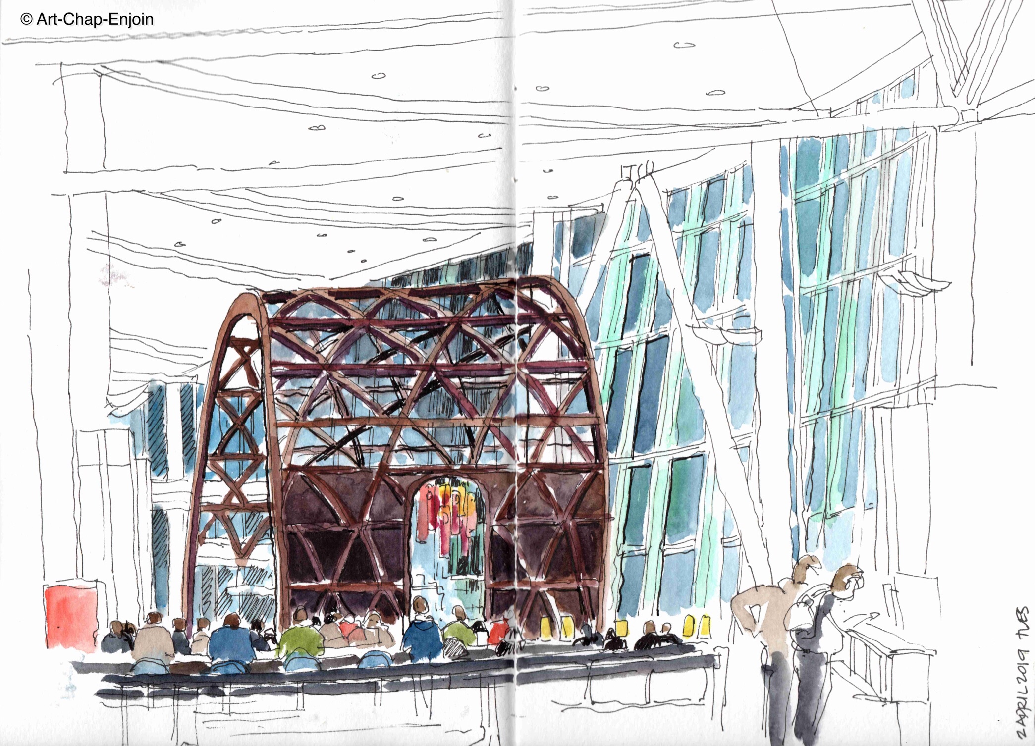 I didn’t have time to sketch at the airport in Providenciales – it was very crowded and it wasn’t long after I got through security that we boarded. Instead I sketched this in Toronto between flights. In this part of the airport there are these peculiar shaped tables – like blue stars and tree trunks. Given the chaos around the world it was surprisingly normal at the airport. In case you are wondering I have already made it back home safely!