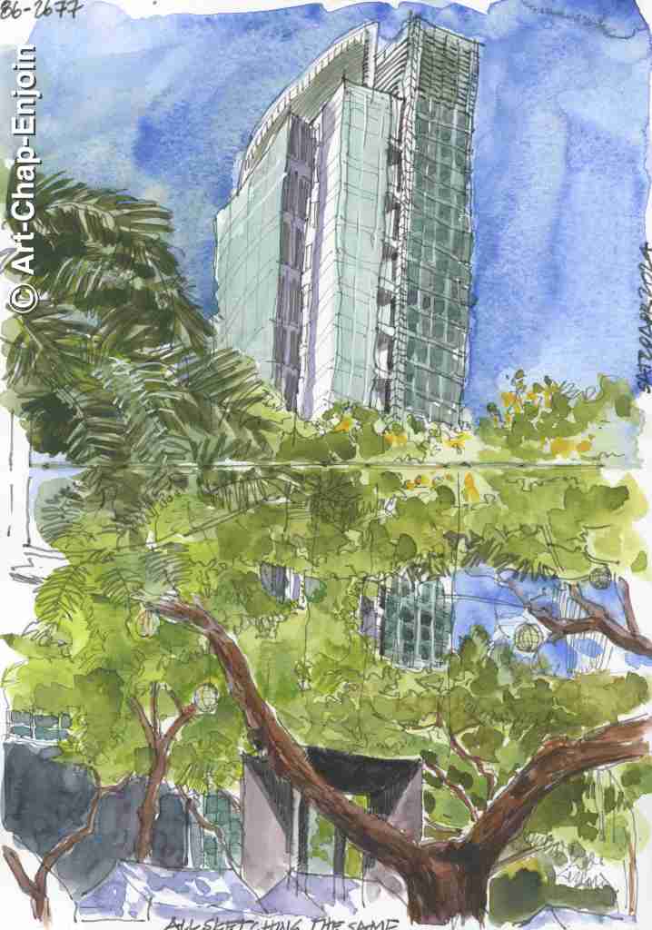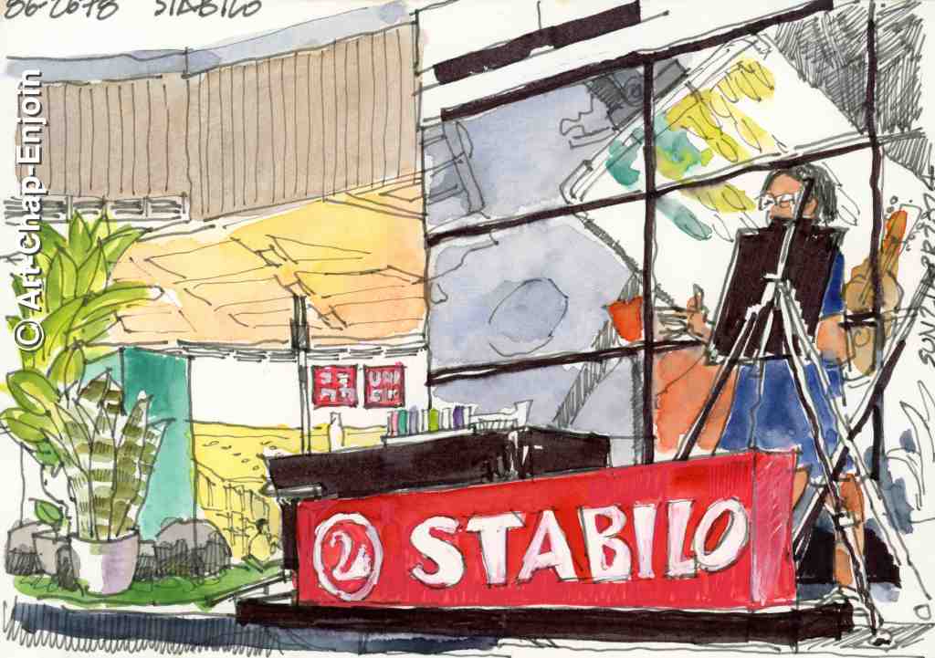 On Sunday 21 April we went to a Stabilo Boss launching event (at SM North EDSA) for their Nature Colour marker pens, with #UskQuezonCity. I always thought Stabilo only made highlighter pens! I started this sketch while Millie (@cmdjdraws) gave an introduction to #UrbanSketching and then continued when Don Tantiado (@don_candrawlines) did a demo using the markers (that’s his drawing on the screen in my sketch). The second sketch (bit of a disaster) is what I drew (coloured with Stabilo Boss markers), when Don gave us an exercise to draw the person next to us.