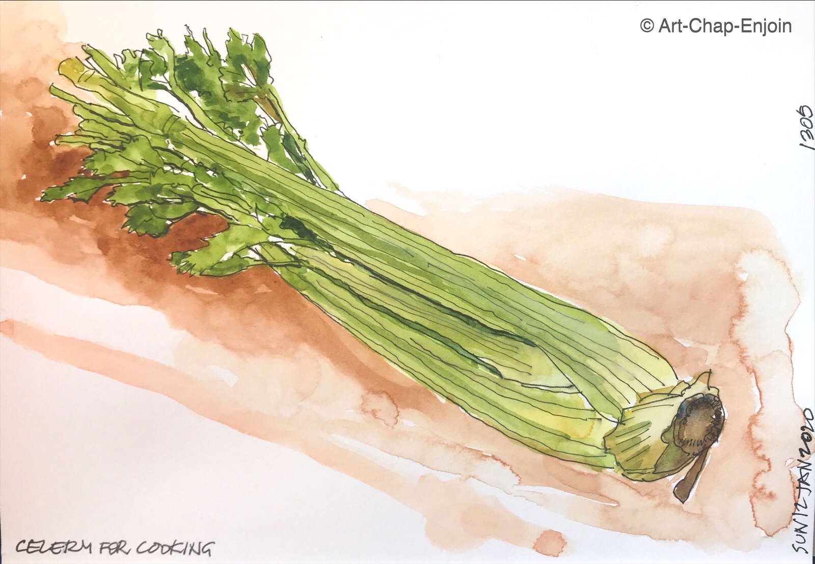 We are trying to make our fresh veggies last as long as possible as it’s not that easy to buy them at the moment. When I was at the supermarket on the weekend I had to queue up for two hours and then it was a bit of a mad panic to buy some basics before they sold out. So this sketch is of our dinner ingredients the other night – mixed beans and Bok choy or Chinese cabbage…with a few little added spices and extras.