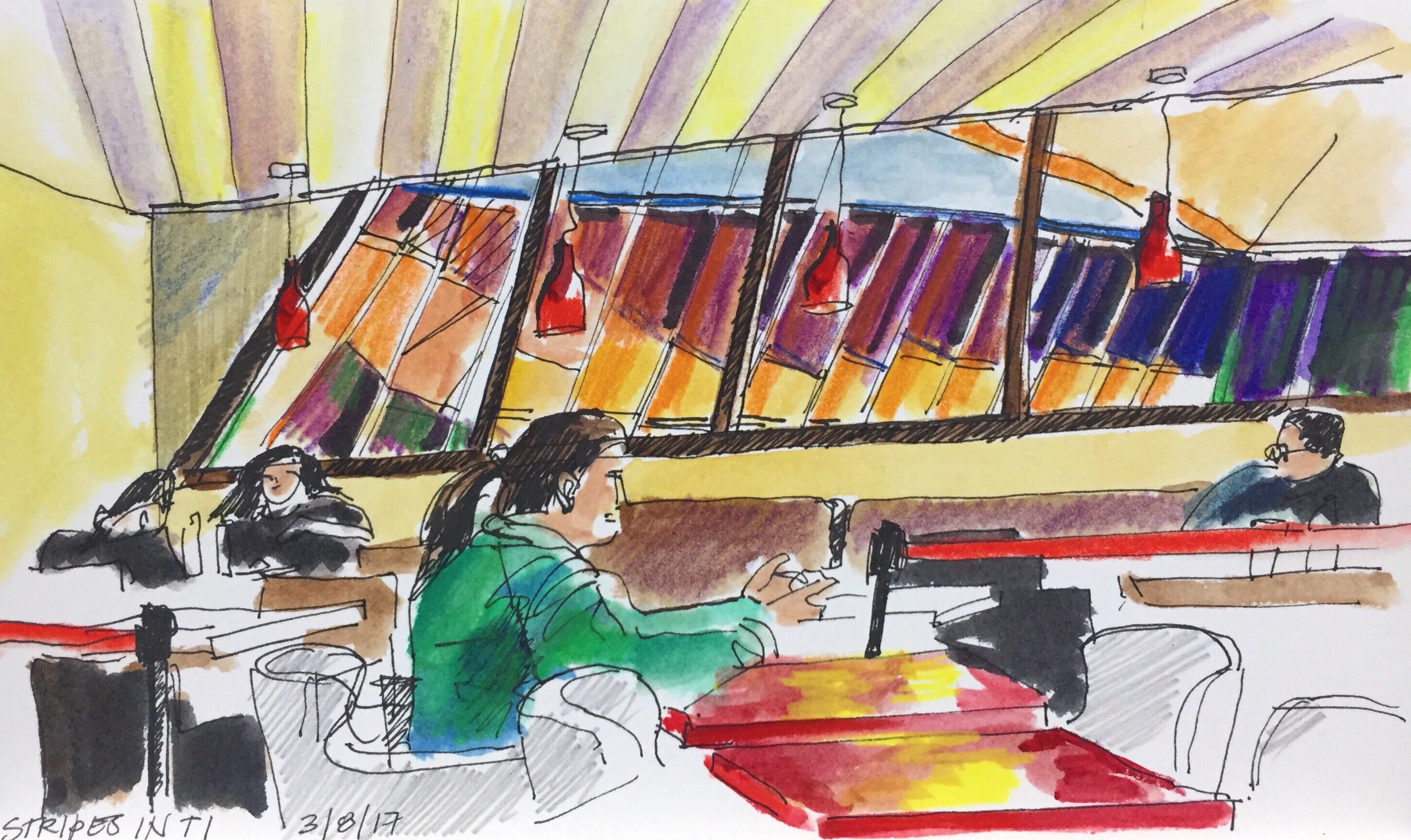 Yup it’s yet another view of my hotel room! Next post will be something outside, I promise. This was done in watercolour, ink and watercolour pencils – I was pleased with the way this one turned out compared to my more recent efforts.